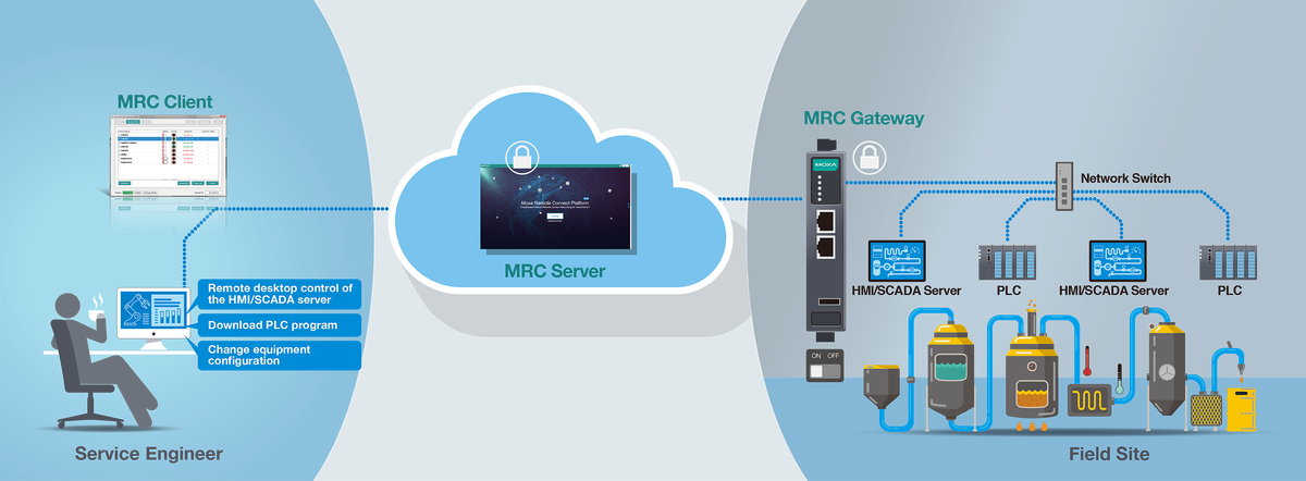 One means to leverage Machine-as-a-Service is Moxa Remote Connect (MRC), an easy-to-use, highly secure, and exceptionally versatile networking solution designed to seamlessly bridge field devices, engineers, and application servers together over the Internet for industrial applications. The solution combines Moxa MRC Servers, MRC Gateways, and MRC Clients: