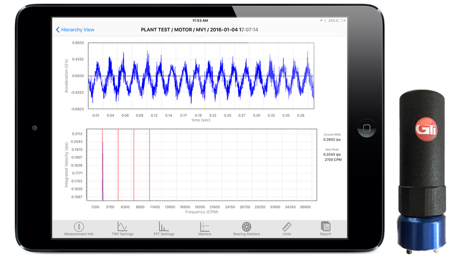 Developed specifically for the iPad, the new sensor connects seamlessly over Bluetooth 4.0, is Class 1/Div 2 approved and has a field replaceable battery that lasts up to 5 years. A computer processor is also built into the accelerometer allowing GTI's software to perform more advanced functions not available with other sensors.